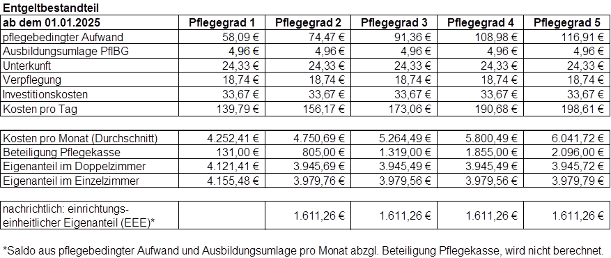 Alle oben genannten Pflegesätze werden regelmäßig neu mit dem Landschaftsverband Westfalen-Lippe und der Arbeitsgemeinschaft der Pflegekassen in NRW vereinbart. Daher können wir für die Aktualität der jeweils genannten Beträge keine Gewähr geben. Druckfehler und Irrtümer sind vorbehalten.